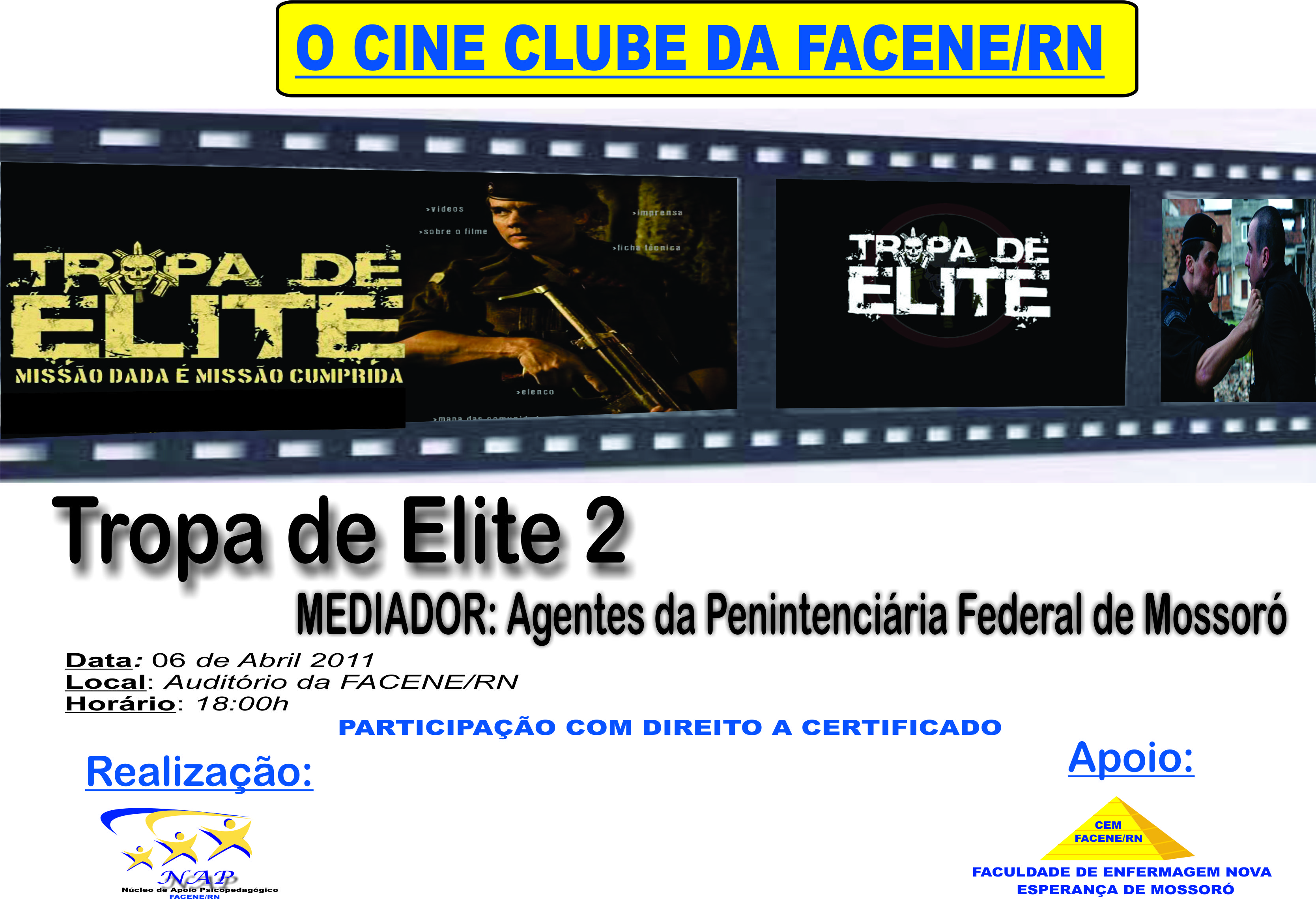 Dia 06/04/2011, às 18h, no auditório Kátia Santiago, será exibido o filme TROPA DE ELITE 2, dentro do projeto CINI FILOSÓFICO. A mediação será feita por Agentes da Penitenciária Federal de Mossoró. Atendendo solicitação da UERN e da Faculdade Mater Christi, serão oferecidas 60 vagas aos alunos destas IES, 30 para cada uma, sendo que para Mater Christi as vagas são destinadas aos alunos do curso de Direito, enquanto que para UERN são destinadas aos diversos cursos daquela instituição.